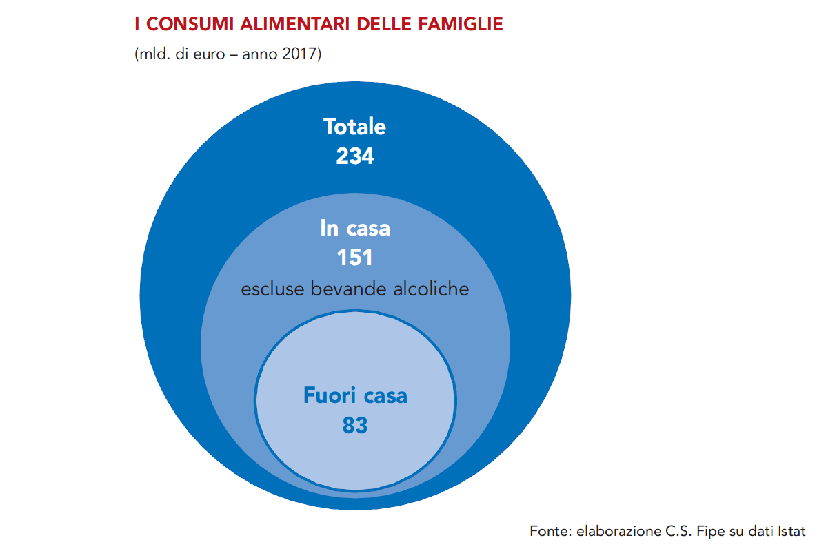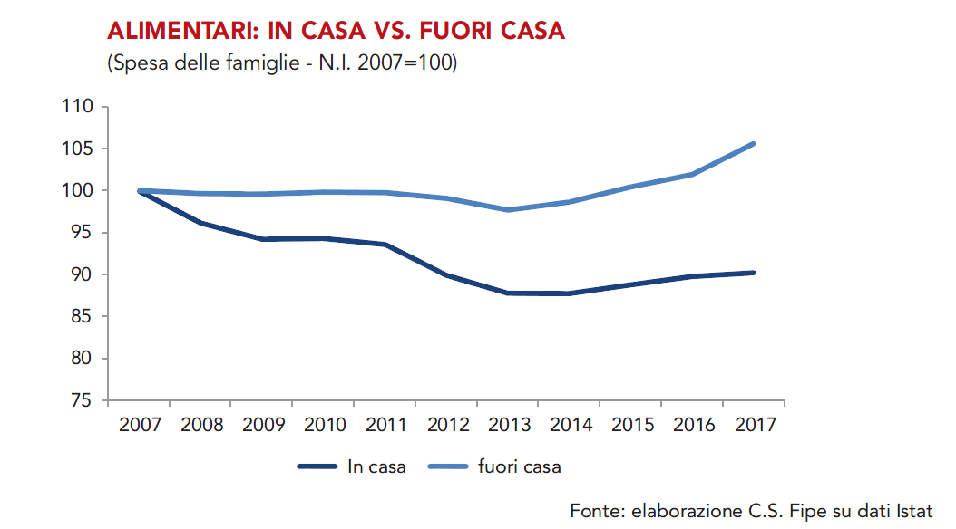 Oggi il 36% della spesa delle famiglie per prodotti alimentari transita fuori casa e il dato più significativo è che mentre i consumi nella ristorazione hanno ripreso a crescere quelli in casa diminuiscono.
