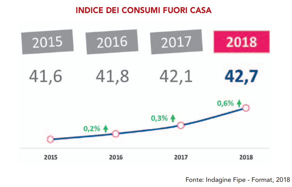 L’indice dei consumi fuori casa, con il quale si rileva la tendenza degli italiani a consumare i pasti fuori casa, nel 2018 si è attestato a 42,7 in crescita rispetto al 42,1 del 2017.