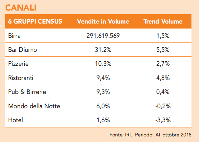 Diciamo pure che, ad eccezione degli hotel, tutti i canali del fuori casa stanno performando bene, a testimonianza del fatto che sono “l’habitat” ideale per la birra. Il diurno, che sviluppa il 31,2% dei volumi e ha un trend di crescita del 5,5%, conquista il podio più alto, seguito da pizzerie (9,4%) e ristoranti e pub che si confrontano in uno strenuo testa a testa (9,4% vs 9,3%).