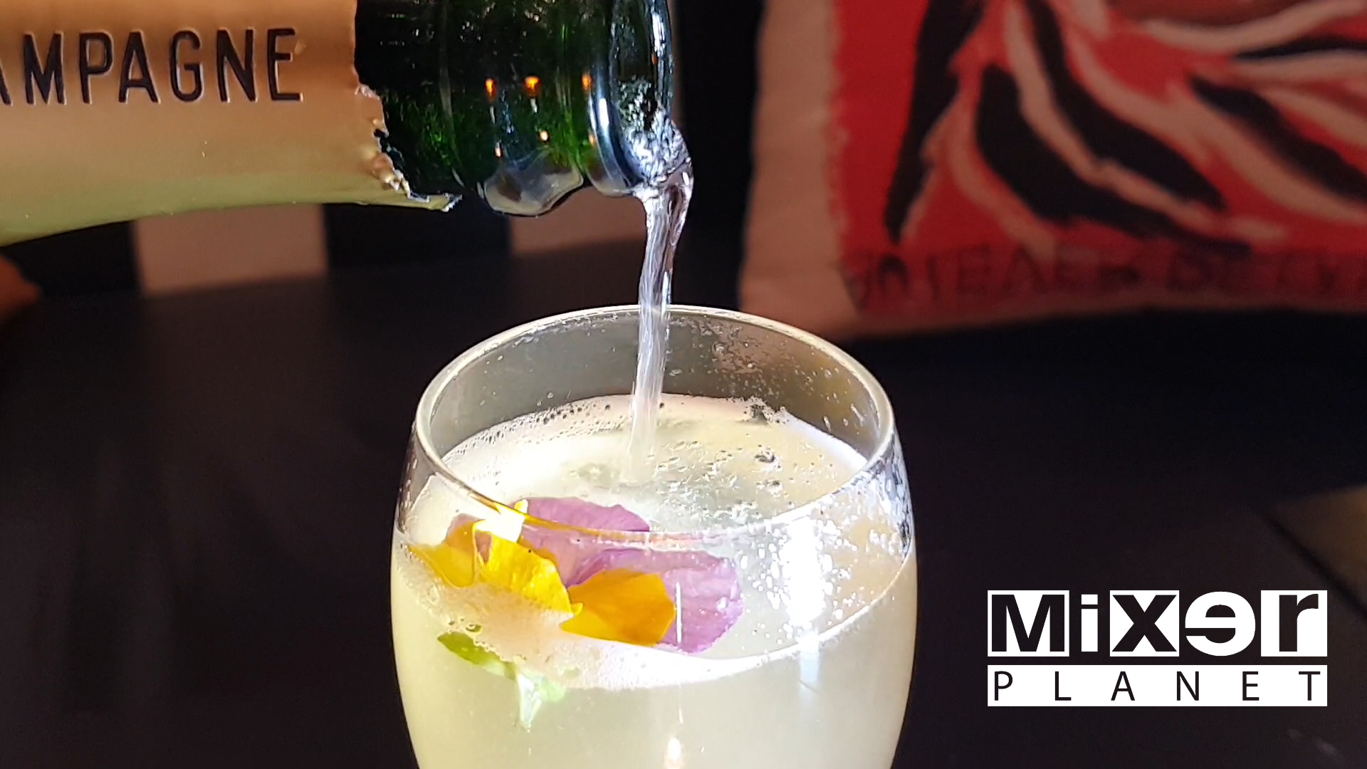 Lo champagne e il gin sono protagonisti, insieme al succo home made di me, del signature cocktail di benvenuto di Amo: il Fizzy Apple.