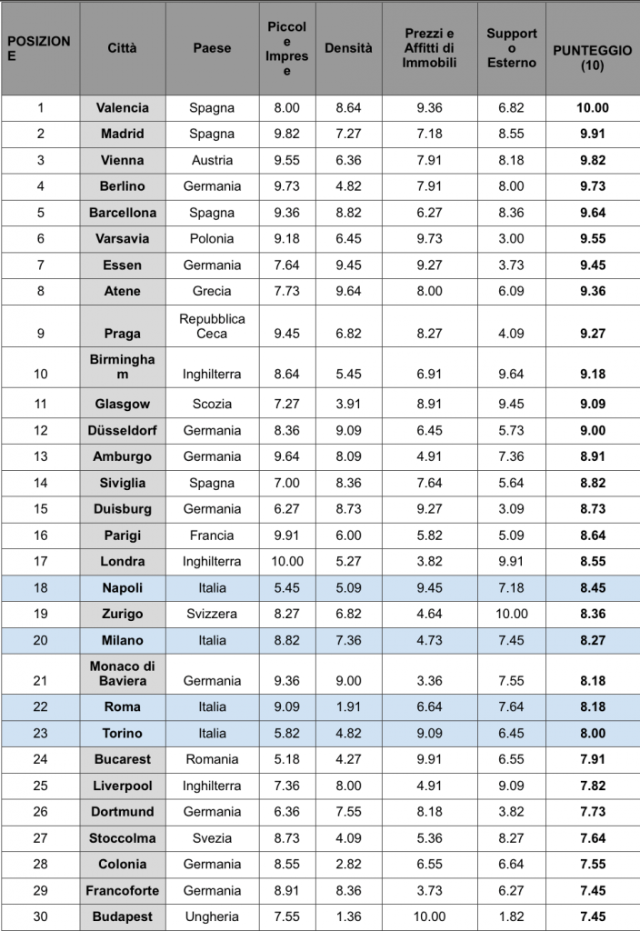 Roma è 22esima nell’Indice e al terzo posto in Italia, nonostante sia in testa nel Paese sia per la quantità di Piccole Imprese che per “iniziative” (criterio incluso in Supporto Esterno), sintomatico di una forte presenza di piccole aziende e un interesse per l’imprenditoria online. Tuttavia, la Capitale italiana mostra punteggi modesti in termini di densità, il che indica la presenza di un grandissimo mercato ancora da sfruttare. Inoltre, nonostante gli alti livelli di disponibilità di Beni Immobiliari, gli affitti esorbitanti frenano gli imprenditori.