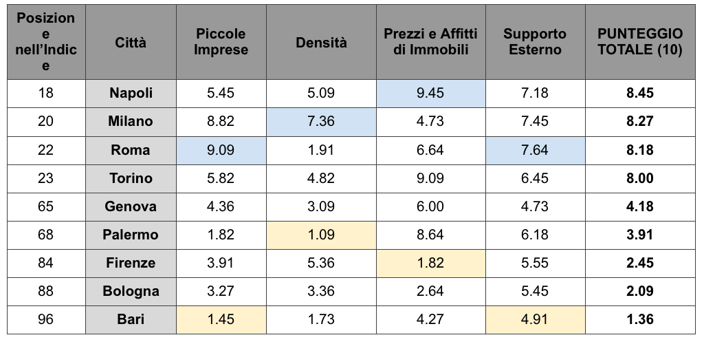 Firenze si colloca in basso per quanto riguarda la disponibilità e prezzi/affitti di beni immobili: solo 91esima nell’Indice. Torino e Napoli hanno invece buoni punteggi in questa categoria, probabilmente una delle ragioni dell’alto numero di imprese indipendenti.