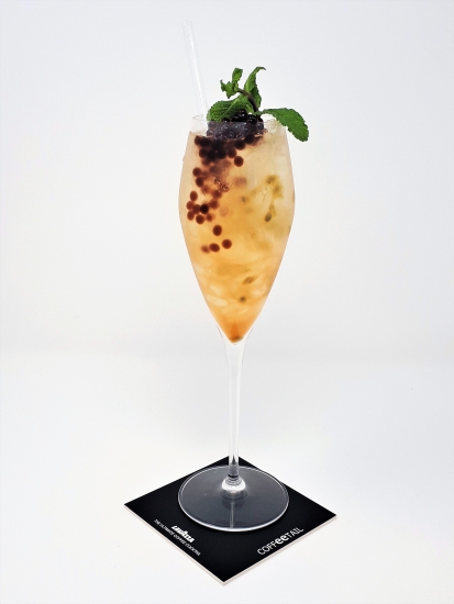 Mescolare leggermente e finire con perle di caffè e foglie di menta.