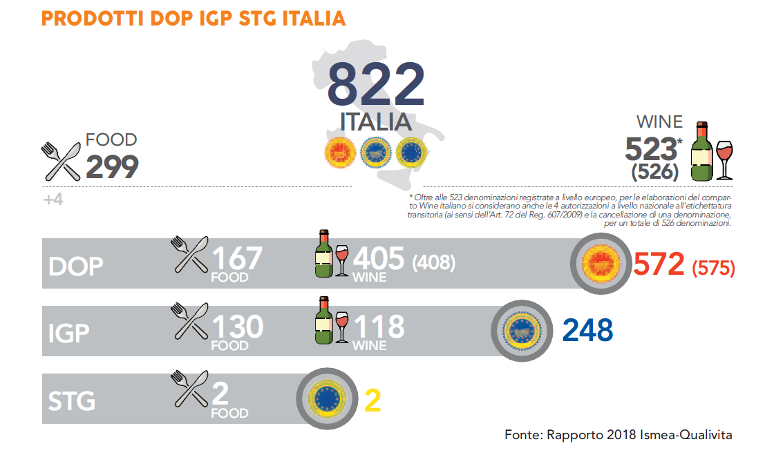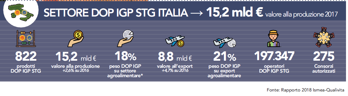 Quando si parla di eccellenze alimentari nel nostro Paese, non si può prescendire dalle IG Food e Wine, un settore forte di 822 prodotti, che valle alla produzione oltre 15,2 miliardi, cresce del 2,6% (superando quindi il settore totale italiano che segna +2,1%) e pesa per il 18% sul valore totale agroalimentare.