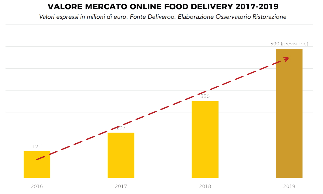 Il mercato del food delivery, senza contare il take away, nel 2018 valeva 1,1 miliardi in Italia. L’online food delivery, secondo le stime di alcuni operatori del settore, ha avuto una costante crescita: 121 milioni nel 2016, 207 milioni nel 2017 (+71%), 350 milioni nel 2018 (+69%) e si prevedono 590 milioni per il 2019. “La comparsa di numerosi aggregatori e distributori di cibo a domicilio, che tendenzialmente analizzano i big data relativi ai clienti senza condividerli con i ristoratori – prosegue Ferrari – apre a nuovi scenari, come la comparsa anche in Italia delle dark kitchen, cioè laboratori di produzione di cibo non aperti al pubblico che vivono grazie alle piattaforme o che appartengono alle piattaforme stesse, e l’uso concorrenziale dei dati per scoprire e cavalcare i trend prima degli altri.”