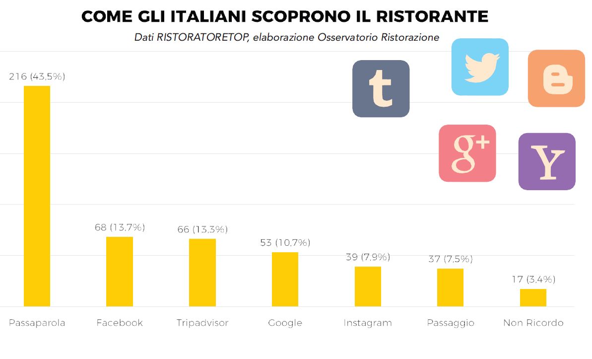 Un’indagine inedita dell’agenzia di marketing RistoratoreTop contenuta nel Rapporto ed effettuata sui clienti di 500 ristoranti distribuiti tra Milano, Roma, Torino, Trento e Firenze, spiega con sorpresa che il metodo di scelta del ristorante più diffuso nel 2019 è, come nell’era pre-internet, il passaparola (43,5%), seguito da Facebook (13,7%), Tripadvisor (13,3%) e Google (10,7%) e Instagram (7,9%). “Il Rapporto intende raccontare il settore – conclude Ferrari – tanto dal punto di vista dei ristoratori quanto dei consumatori affinché i primi acquisiscano consapevolezza dei cambiamenti nelle abitudini dei secondi. Se i ristoratori, come categoria, sapranno intercettare ed interpretare il cambiamento, potranno arginare la snaturalizzazione delle tradizioni e l’omologazione dell’offerta.”