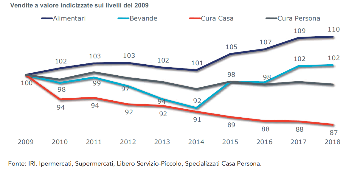 Il 2018 chiude con le sole vendite a valore di Alimentari e Bevande in lieve crescita[/caption]