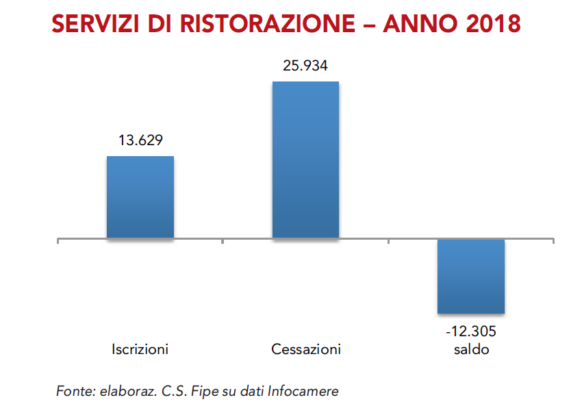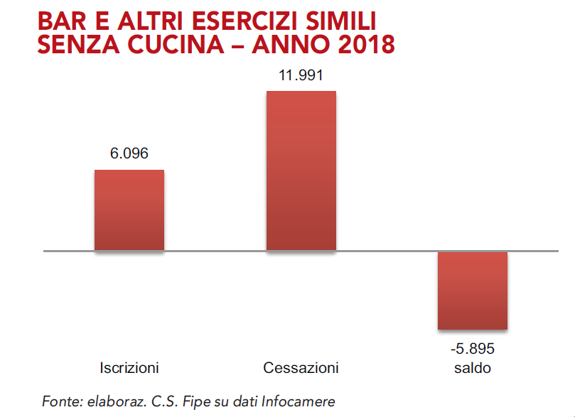 Nel segmento bar l’anagrafe imprenditoriale indica che nel 2018 hanno avviato l’attività poco più di 6mila imprese, mentre 11.991 l’hanno cessata. Il saldo è stato negativo per 5.895 unità.