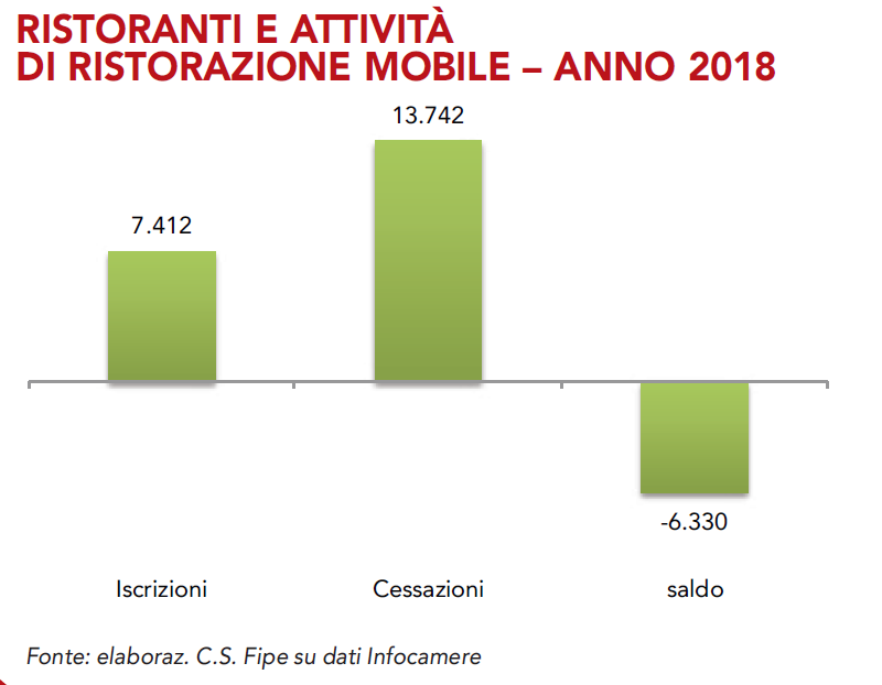 Tra i ristoranti hanno avviato l’attività 7.412 imprese e 13.742 l’hanno cessata portando il saldo a -6.330 unità.