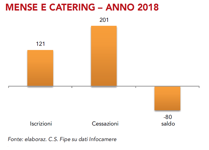 Il quadro della nati-mortalità del settore va completato con i dati relativi alla ristorazione collettiva dove si registra un turnover imprenditoriale relativamente modesto con 121 iscrizioni e 201 cessazioni. C’è da dire, tuttavia, che le imprese che svolgono attività di fornitura di pasti preparati e ristorazione collettiva sono poco più di tremila unità, concentrate perlopiù in Lombardia, Lazio e Campania.