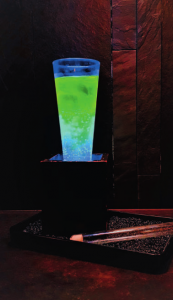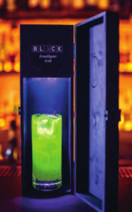 Il Blockbox viene servito in una scatola nera contenente un liquido che sembra kriptonite. La fluorescenza del cocktail è completamente naturale, esaltata dalla luce UV