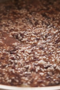 In una padella tostate il riso senza condimento sfumando con il brodo. Tagliate a fettine sottili le foglie di radicchio e unitele al riso. Procedete con la cottura per circa 14 minuti, dopo 10 aggiungete il succo di melagrana e salate.