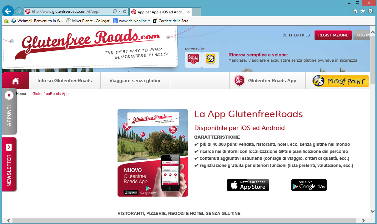Dr. Schär lancia GlutenfreeRoads, l'applicazione del portale di viaggi gluten free www.glutenfreeroads.com che dedicata a chi segue una dieta senza glutine. Il database dell’app - disponibile in forma gratuita nell’App Store di Google Play per chi usa dispositivi Android, e nell'Apple App Store per iOS - raccoglie oltre 40.000 ristoranti, pizzerie, bar, hotel e punti di vendita che offrono prodotti e menù senza glutine nel mondo. E il numero di aderenti è in costante aggiornamento grazie all’aggiunta di nuovi locali e punti di vendita.
