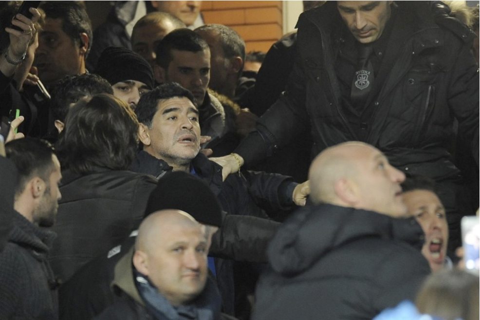 Maradona va al San Paolo e il Napoli batte la Roma 3-0 nella semifinale di Coppa Italia. Buon per lui, ché il Mito è il Mito, ma l’ultima volta che aveva visto gli azzurri era stato per Roma-Napoli 2-0, e un’eventuale nuova sconfitta coi giallorossi avrebbe suscitato considerazioni scaramantiche non troppo gradevoli. Diego in tribuna, comunque, fa sempre più notizia di Higuain in campo. Così, le inquadrature e i cori sono tutti per lui, e De Laurentiis deve fare buon viso a cattivo gioco (non lo ama: si vede lontano un miglio!) regalandogli una maglia personalizzata e promettendogli improbabili incarichi di rappresentanza in società. Ma l’immagine più bella della serata è la reazione di Diego a un gol mancato da Callejon sullo 0-0: si blocca a braccia aperte, tutto proteso in avanti, poi scalpita e salta giù di un gradino portandosi le mani alla testa per la disperazione. La reazione di un vero tifoso.
