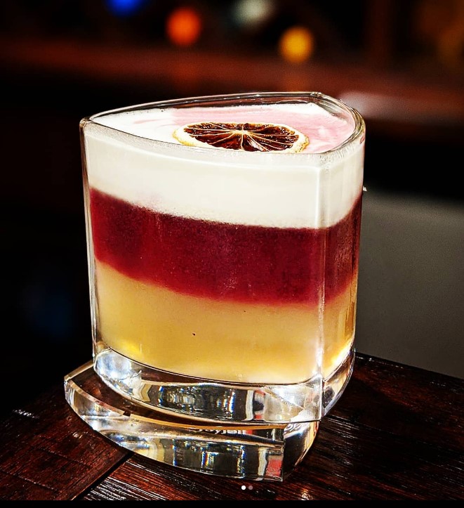 Versare tutti gli ingredienti (tranne il vino rosso) in uno shaker senza ghiaccio ed eseguire un dry shake per 30 secondi. Aggiungere un cubetto di ghiaccio grande e agitare di nuovo per altri 20-30 secondi. Fare un double strain nel bicchiere con una sfera di ghiaccio trasparente. Versare lentamente il vino rosso dal dorso di un bar spoon.