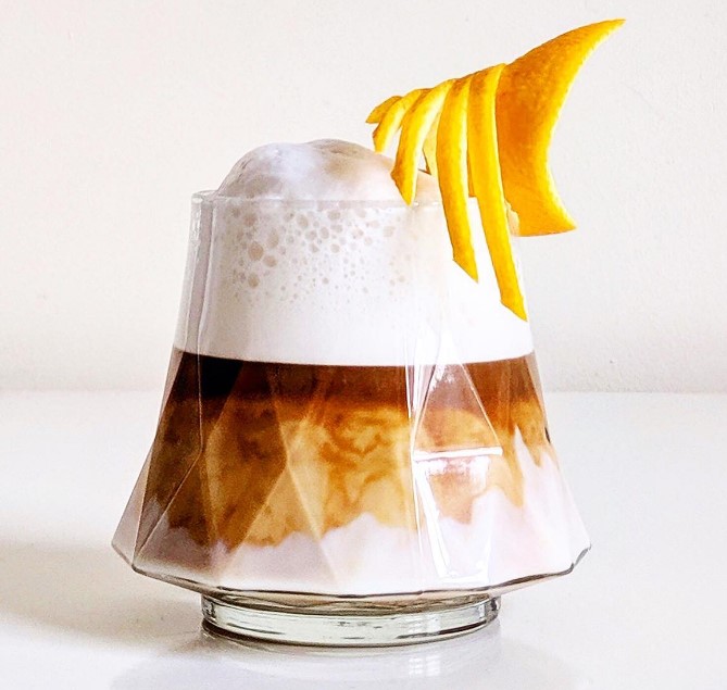 Versare in un mixing glass il latte, un pizzico di cardamomo, il Sauternes e il vermouth e montare con un montalatte. Versare il rum nel bicchiere, aggiungere il composto montato e completare con un top di espresso.