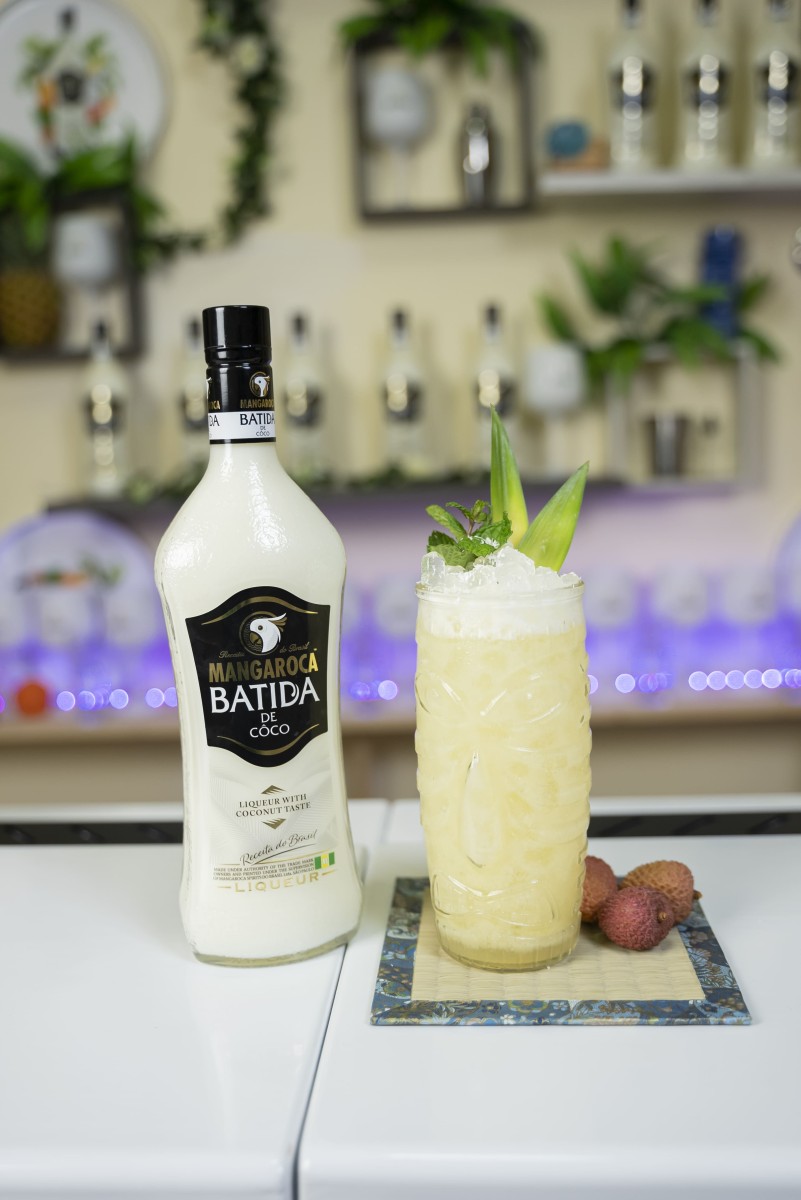 Miscelare in un blender foglie di menta, succo d’ananas, Mangaroca Batida de Côco e Rum. Utilizzare un bicchiere collins alto per servire il cocktail e decorare con delle gocce di angostura e foglie d’ananas.