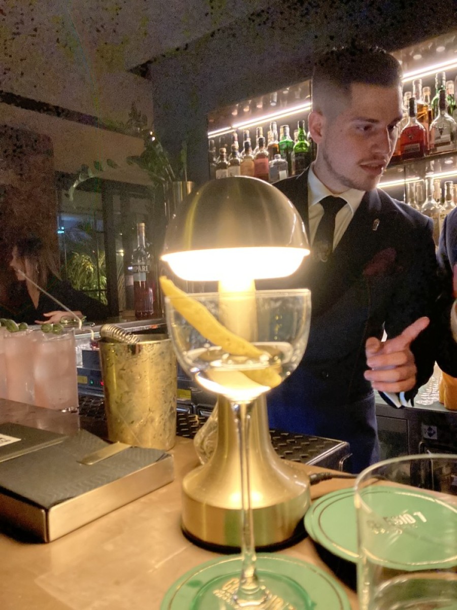 “La lista attuale (partita a novembre scorso, durerà un anno) si ispira agli anni ’Venti attuali, con rimandi a quelli del secolo scorso. Come il locale, ricco di velluti e tende ma con dettagli contemporanei. La tecnologia la mettiamo nei cocktail, usiamo le tecniche più avanzate e abbiamo un lab apposito, visitabile su richiesta” dice Cicalese.