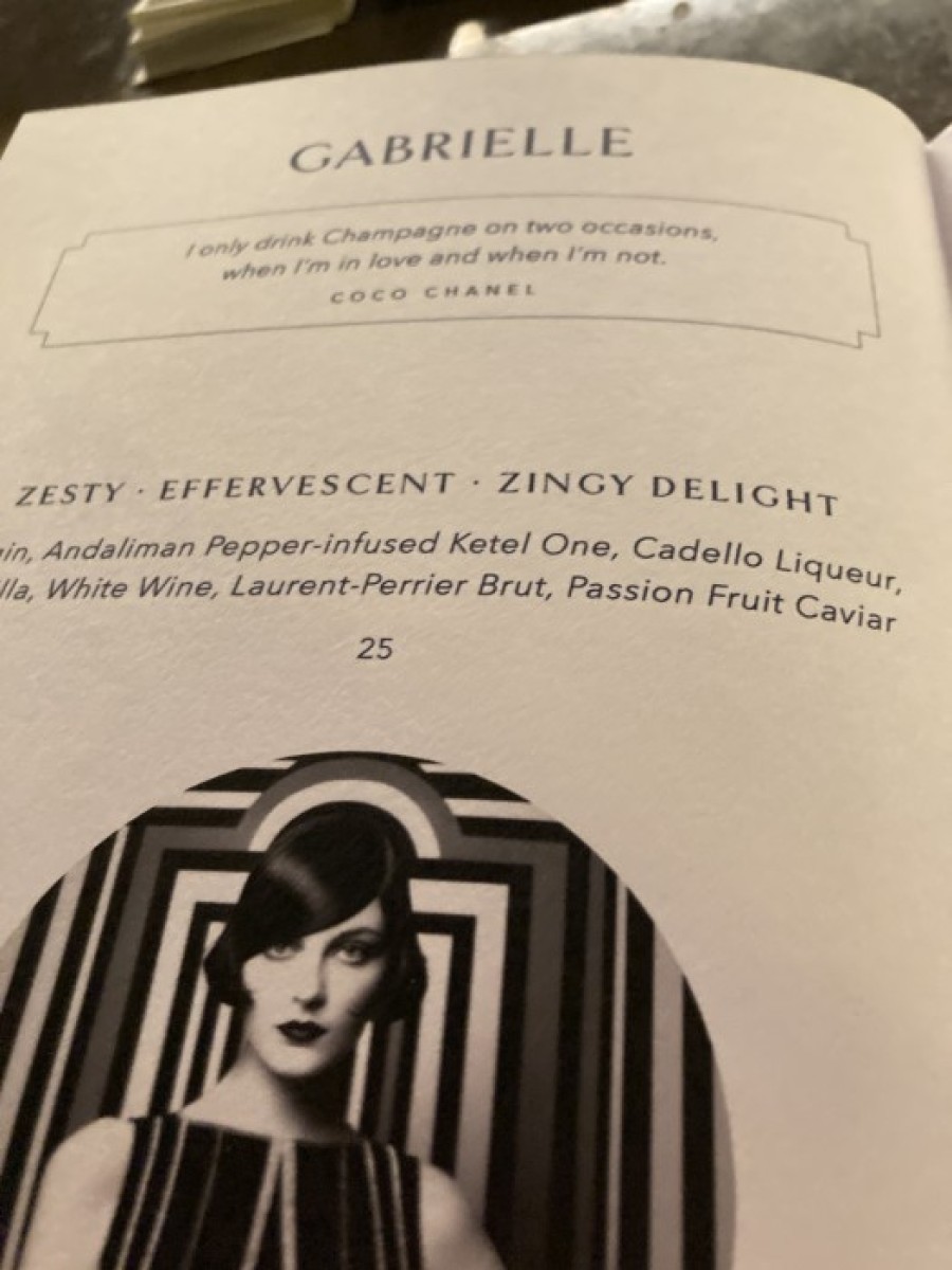 Tra i 21 il best seller al Velvet, ci dice Luca, è il Gabrielle, dedicato a Coco Chanel (71 gin, Andaliman Pepper-infused Ketel One, Cadello Liqueur, Vanilla, White Wine, Laurent-Perrier Brut, Passion Fruit Caviar).