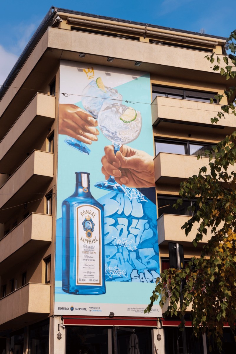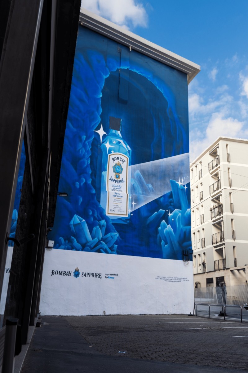 Il murale intitolato “I momenti di connessione” celebra l’amicizia e la condivisione attraverso l’immagine di due mani che si incontrano in un brindisi con Bombay Sapphire. L’opera utilizza i graffiti per ripetere come un mantra il nome del brand, aggiungendo dinamismo e creatività. Al centro, la bottiglia di Bombay Sapphire equilibra l’opera e incarna l’essenza di un momento speciale di connessione.