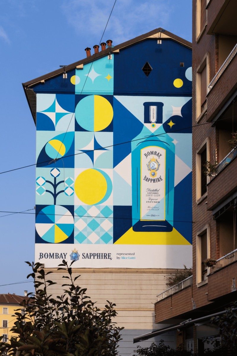 "Up to the sky" è il murales di Porta Genova, dove geometria, luce ed eleganza si fondono per rendere protagonista la bottiglia di Bombay Sapphire. Partendo dal brand pattern, l’artista ha creato una composizione che evoca giochi di riflessi e rifrazioni, un caleidoscopio di forme e colori ispirato alla volta celeste.