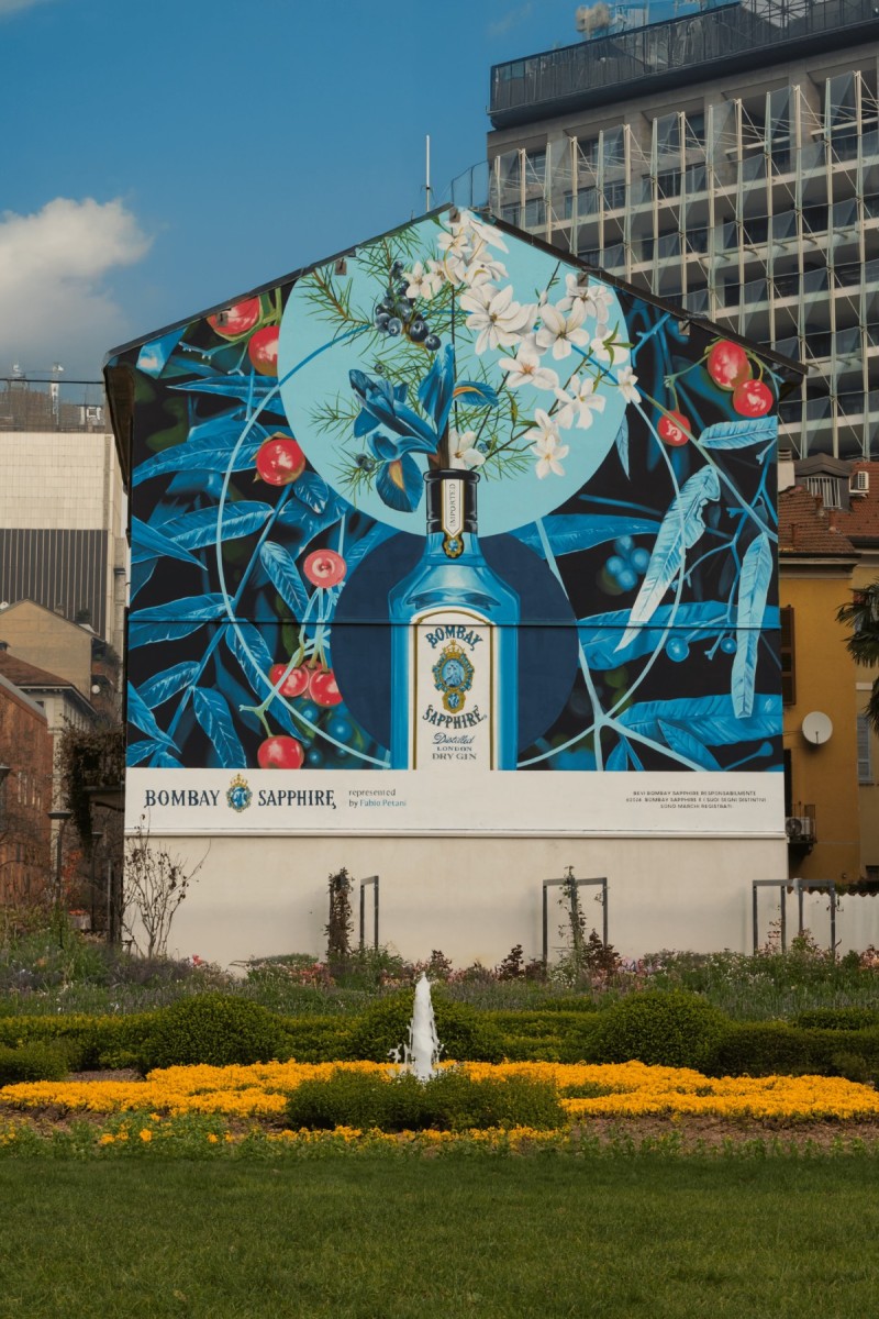 Il murale firmato da Fabio Petani, ispirato alle essenze botaniche di Bombay Sapphire, interpreta il mondo naturale con uno stile artistico che celebra la bellezza delle piante che definiscono il gin. La palette di blu e azzurri richiamano l’identità del brand, mentre le forme geometriche e le figure botaniche creano un dialogo armonioso con l'ambiente circostante. Un'opera che invita a riscoprire la natura e celebra le materie prime di Bombay Sapphire.