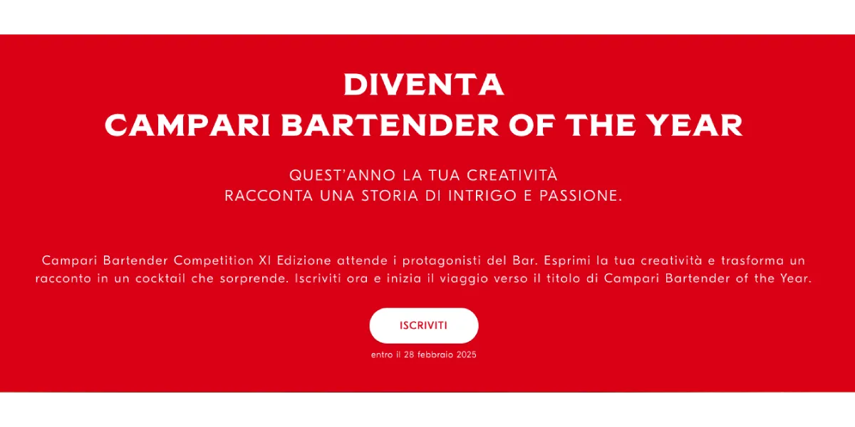 C'è tempo fino al prossimo 28 febbraio per iscriversi all'undicesima edizione di Campari Bartender Competition e vincere il titolo di Campari Bartender of the Year. Cinque le fasi di valutazione in programma per arrivare all'ultimo atto della sfida, quando durante la finale solo tre finalisti si contenderanno l'ambito riconoscimento (lo scorso anno erano arrivato alla finalissima Alessandro D’Alessio in forza al Rita Tiki’s Room di Milano, Edoardo Cipriani del Soda Jerk di Verona e Andrea Pace del Drink Kong di Roma).