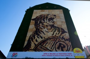 Lo scorso 12 marzo Tigre ha inaugurato la sua Toasteria in Corso di Porta Ticinese 46. L’evento ha richiamato una grande affluenza di pubblico incuriosito già nei giorni precedenti dall’enorme affissione formata da toast (non commerciabili) disposti in modo da raffigurare la tigre del pack dedicato al 90° anniversario del brand. Ma incuriositi anche dal passaparola creato su Facebook. La Toasteria è un locale in stile underground che ben si adatta a quello del quartiere in cui si trova e caratterizzato dal riconoscibilissimo colore giallo, quello della famosa tigre simbolo del brand.