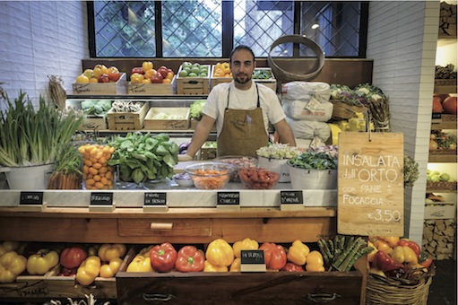 Sul fondo, la postazione “insalate dell’orto”, una credenza riconvertita in espositore frutta e verdura, per lo spuntino del pranzo, con la vecchia impastatrice e i sacchi di farina impilati.