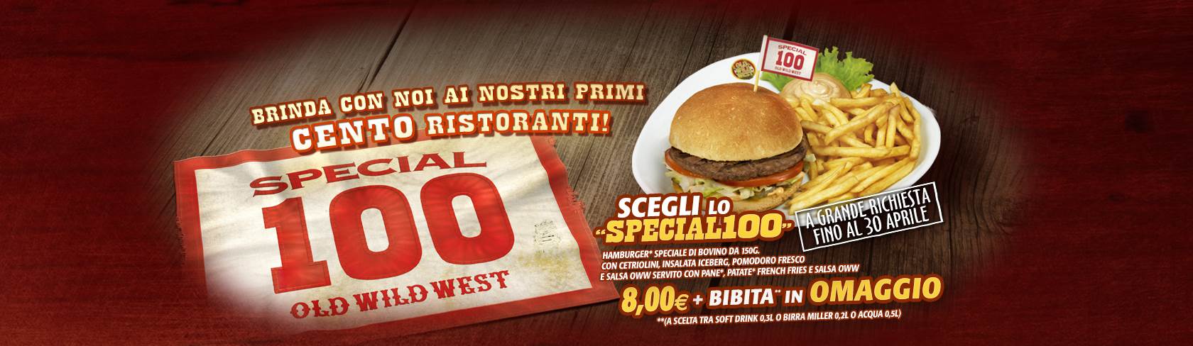 Complice il grande successo registrato finora, la promozione Special 100 - con la quale Old Wild West, la più diffusa catena di ristoranti steak house in Italia, ha festeggiato l’apertura del suo ristorante numero 100 - sarà prorogata per tutto aprile. Fino a fine mese e in tutti i ristoranti d’Italia che aderiscono all’iniziativa infatti si potrà ancora gustare il menu speciale per gusto e per prezzo: hamburger Special 100 con bibita o birra in omaggio a soli 8 euro. Un modo per continuare a festeggiare il traguardo raggiunto dal marchio creato da Cigierre, Compagnia Generale Ristorazione SpA.