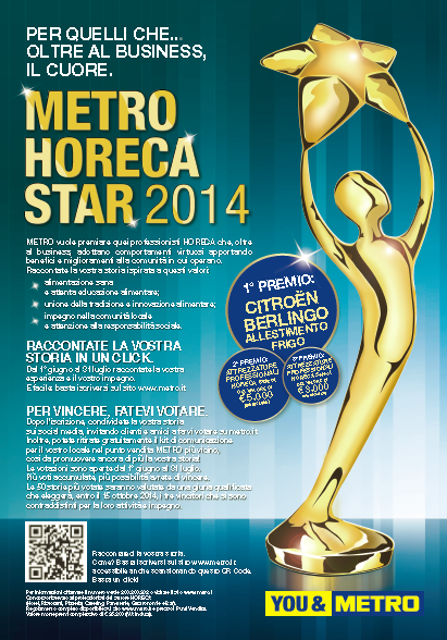 valore possano avvenire solo attraverso un modello di sviluppo sostenibile in termini sociali ed ambientali. E per dare voce e premiare i comportamenti virtuosi dei propri clienti, che costituiscono nel nostro Paese la spina dorsale del commercio, Metro Italia ha indetto un concorso per celebrare i propri 50 anni nel mondo: Metro Horeca Star 2014 che premia le più belle storie imprenditoriali caratterizzate dai valori di sostenibilità ambientale e sociale. Un concorso aperto a tutti i titolari di piccole e micro aziende del settore Horeca, ristorazione e bar, che credono che la sostenibilità sia un investimento per il futuro e non un semplice costo nel breve periodo. «Vogliamo dare voce ai professionisti del settore Horeca - nostro target di riferimento cui offriamo ogni giorno la qualità dei nostri prodotti, professionalità e servizi dedicati per il successo del loro business - premiando coloro che si distinguono in azioni di responsabilità sociale e ambientale - ha dichiarato Philippe Palazzi, amministratore delegato Metro Italia -. Sono migliaia di eroi silenziosi che scelgono i pilastri della Responsabilità Sociale di Metro, operando a capo di piccole e micro imprese che danno lavoro all’80% degli italiani creando il 70% di valore aggiunto».