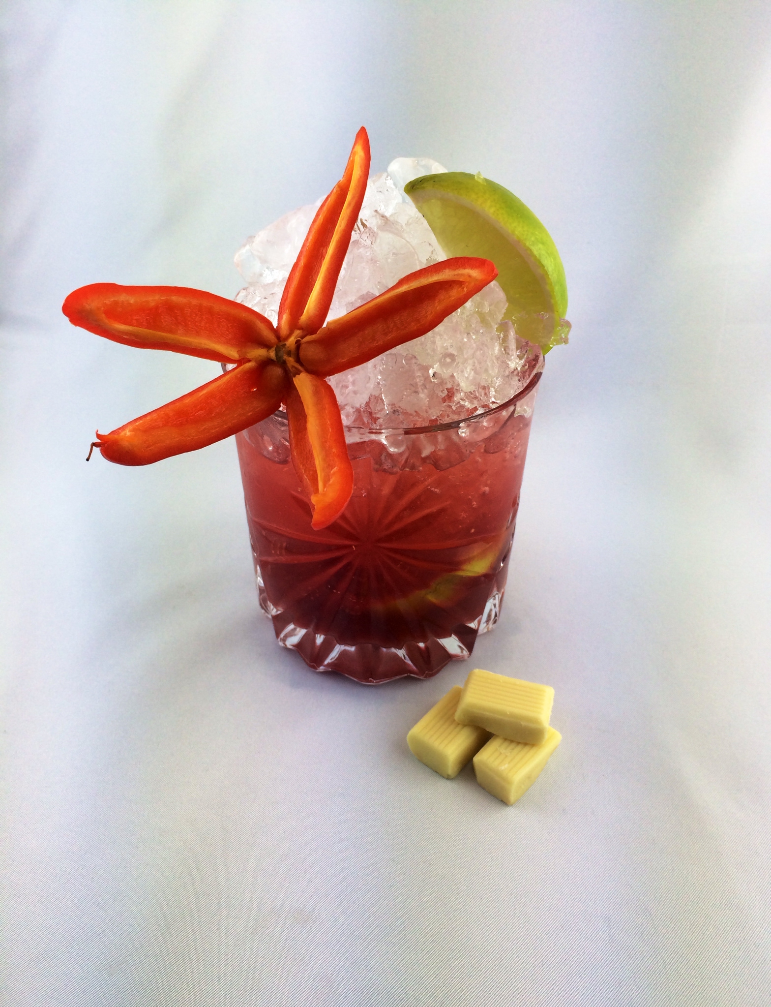 Pestare leggermente il lime con lo zucchero, aggiungere la purea di fragole fresche, la vodka e il peperoncino macinato. Colmare con del ghiaccio crushed e mescolare. Cioccolato bianco come accompagnamento del drink.