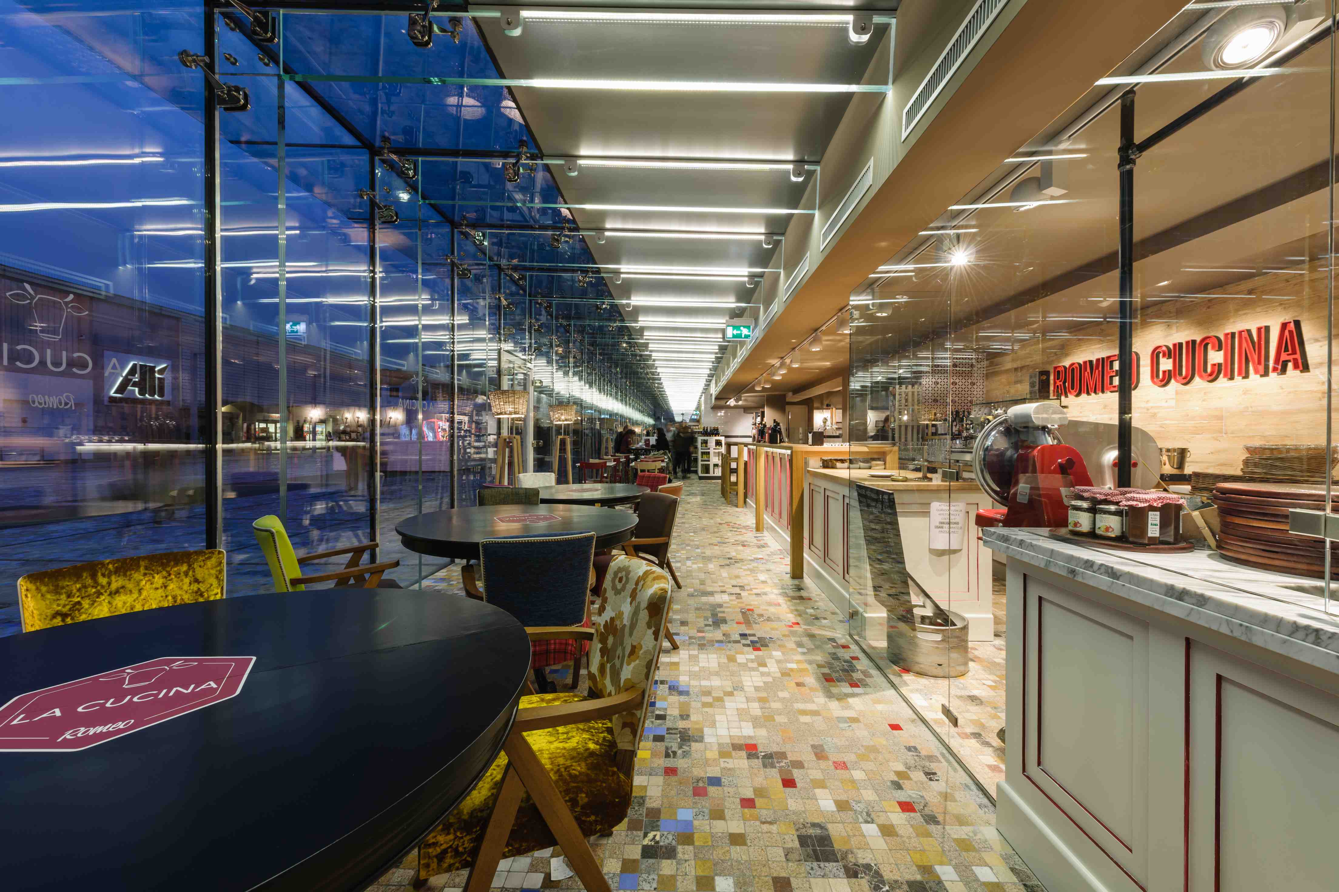 Il colpo d’occhio sull’esterno è decisamente d’impatto: un lungo volume in vetro e acciaio, interseca Piazza Candiani, in una continuità tra interno ed esterno che caratterizza scenograficamente tutta la lunghezza dell’ambiente. Lo scambio interno/esterno prosegue sul mosaico del pavimento che Romeo condivide con il resto del piazzale, creando un’originale armonia, piacevolmente accentuata dalle vetrate perimetrali. Il mosaico è stato voluto da un mestrino d’eccezione, l’artista e designer urbano Luigi Gardenal, che ha pensato a una composizione di tessere-pixel multi-colori e multi-materiche dove le sfumature sul blu e sul giallo alludono alla dialettica lagunare tra terra e acqua.