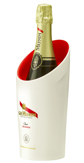 invece la forza centripeta della seconda novità targata Natale 2014, il G.H. Mumm Mini Ice Bucket, glacette che avvolge come un abito la bottiglia. G.H. Mumm Mini Ice Bucket è un involucro dall’identità spiccata e grintosa, messo a punto per creare un microambiente ideale per la Cuvée e proteggerla da pericolosi sbalzi termici. Leggera, comoda, pratica, trasportabile, traduce un’esigenza funzionale - mantenere costante la temperatura dello champagne fra 6°- 8° gradi - in un oggetto empatico. Il cromatismo esuberante del Cordon Rouge, nastro icona della Maison, fa da guida a un design fluido e aerodinamico, lampo di colore che illumina il manico e conferisce dinamicità al bianco puro, ulteriormente mosso da una sapiente scanalatura intorno al bordo superiore. Sul frontale campeggia il logo della Maison, mentre sul retro, dedicato alla geek generation, si trova il QrCode per navigare nell’universo G.H. Mumm. Non solo una glacette, quindi, non solo una borsa termica, ma un contrassegno di originalità e stile per tavole contemporanee. Disponibile al prezzo consigliato di 55,00 euro.