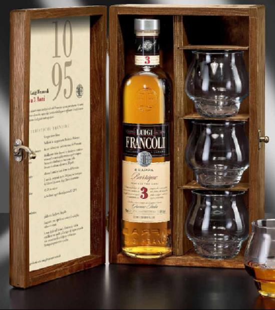 Sembrano pochi, eppure tre anni corrispondono a 1.095 giorni. E tanti sono quelli trascorsi, fra tini di rovere e barriques, da questo distillato. La confezione: 1 bottiglia grappa Luigi Francoli riserva 3 anni, 3 bicchieri degustazione.
