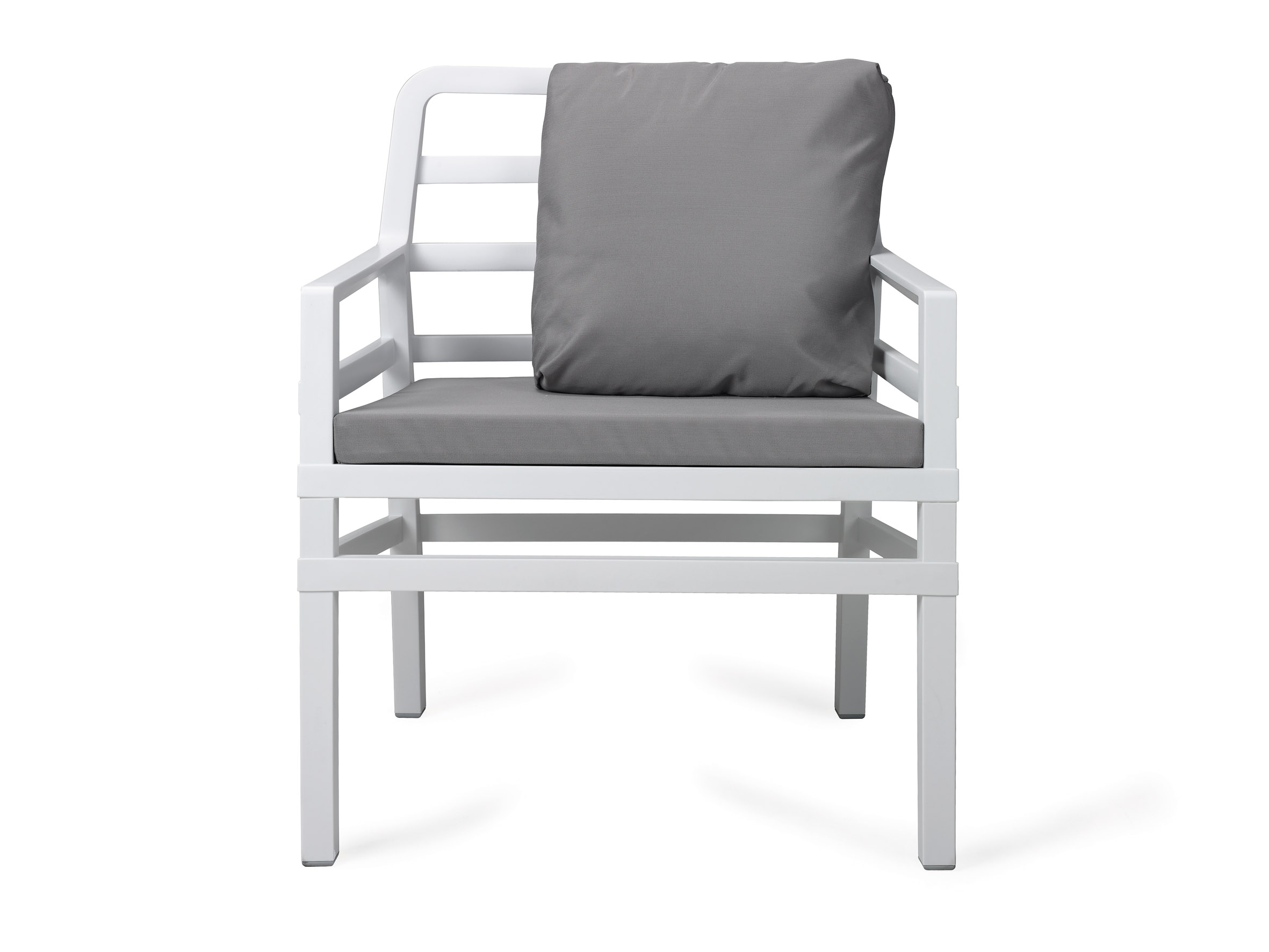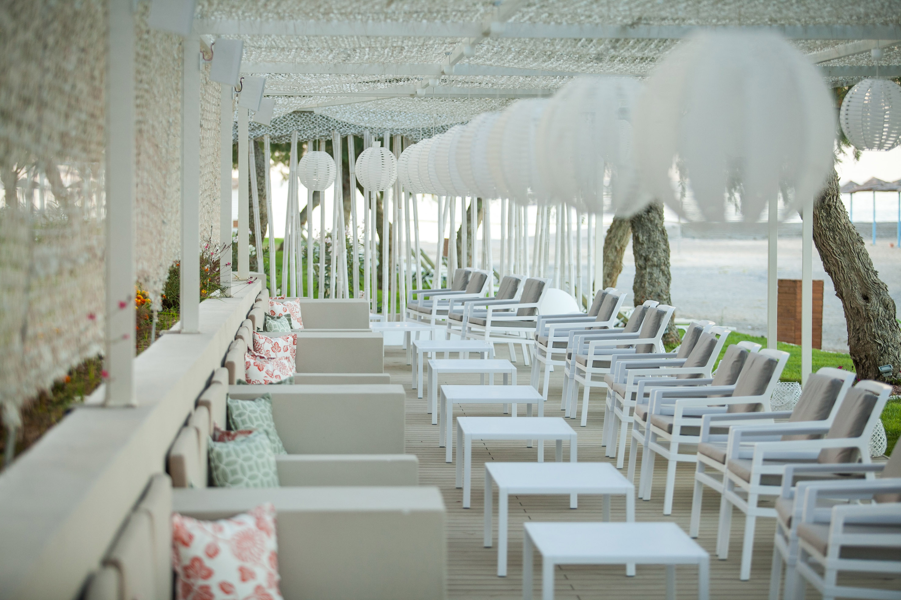 Aria, la poltroncina per esterni di Nardi realizzata in resina fiber glass con pendant di cuscini imbottiti, è protagonista del suggestivo dehor e beach bar dell’Ammos Beach Club, un resort sul mare nell’isola greca Kos.