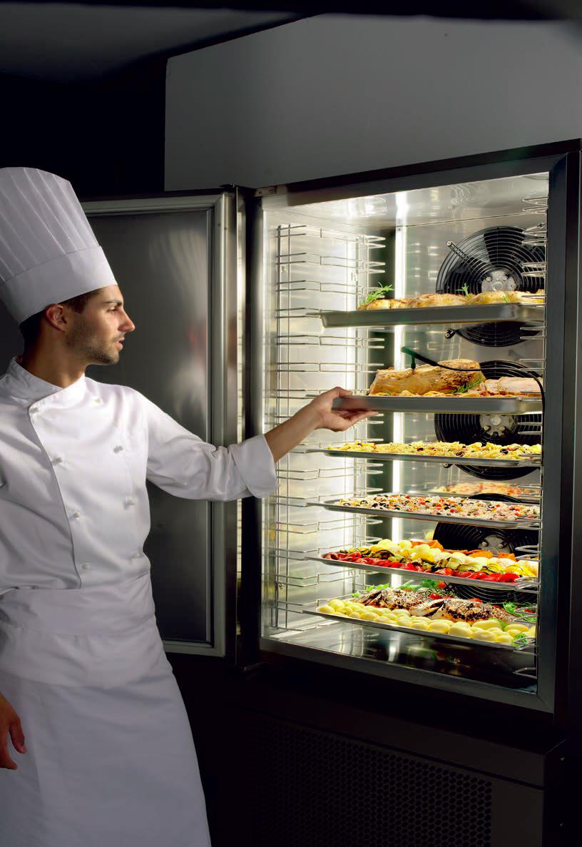dell’abbattimento riguardo al pesce crudo. Ora mi soffermo su una tecnica che garantisce qualità eccezionale. Provate a pensare a quante volte abbiamo fatto un buffet con tartine, salumi, pane, maionese, ecc. Bene succede che li prepariamo qualche ora prima di solito, forse un giorno prima, ma con risultati deludenti nei colori, salumi bruniti, ossidati, maionese con pellicina, pane secco, insomma non spettacolare, e non basta mettere la fogliolina di prezzemolo fresco o la fettina di limone fresco, come se avessero qualcosa a che fare con quello che avete preparato. Cambiamo passo, cominciamo a capire che si può fare di meglio, di bello, di colorato, di lucido, appagante, invitante. Accendete l’abbattitore di temperatura, mettetelo in posizione -18° strong (circa -42° per i migliori abbattitori). Prendete del pane bianco (tipo per tramezzini), create la vostra tartina, con salume, maionese, pomodorino fresco, gamberetti, tonno e/o quello che volete. Sistemate su teglia bassa con carta forno, quindi inserire il prodotto nell’abbattitore dando uno shock termico. Conservare a -18° ben chiusi. Per il servizio, toglieteli dal conservatore a -18° e metteteli in frigorifero per qualche minuto e poi nel buffett. Risulteranno belli per alcune orette senza avere problemi. Provate a farlo con un pozzetto o un congelatore classico, poi capirete cosa vuol dire avere una tecnologia avanzata che vi aiuta in fase di preparazione, conservazione e gestione del cibo e menù!