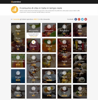 Il nuovo servizio proposto da Quandoo.it consente quindi di scoprire nel dettaglio, quali sono i cibi preferiti dai palati italiani. La landing page è di facile utilizzo e di comprensione immediata, e si basa su dati attendibili ed autorevoli che si rifanno alla ricerca “Cibi: dalla fattoria alla forchetta” condotta dalla Commissione Europea. Grazie al conteggio che il counter aggiorna ogni secondo, è dunque possibile ottenere un quadro affidabile delle abitudini alimentari degli italiani, avendo a disposizione una visione dinamica non solo di quello che si ama mangiare nel nostro Paese, ma anche della spesa che copre le nostre necessità (e i nostri piaceri!) alimentari.