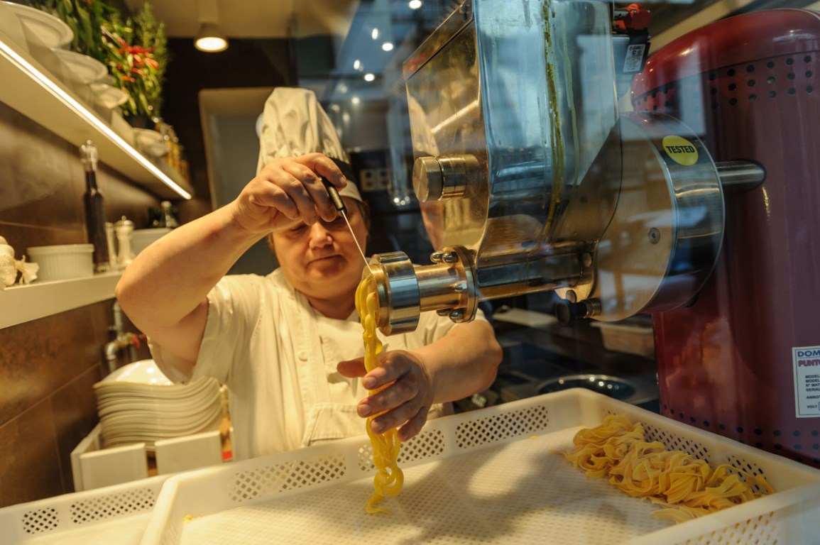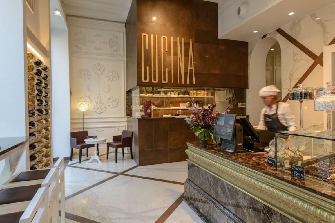 Il locale nasce facendo della trasparenza il proprio baluardo. Già dalla strada è possibile infatti vedere gli artigiani lavorare con sapienza per produrre pasta fresca, cotta e condita al momento, e le più golose proposte dolci, come le bombe alla crema di vaniglia. E dall’arredo del locale emerge perfettamente quest’intenzione. Un lungo bancone espositivo in marmo Emperador Dark, profilato da una cornice in ottone anticato, percorre in orizzontale lo spazio, fino a raggiungere il laboratorio a vista in cui nascono i famosi prodotti da forno, proprio come se fosse un unico, grande ambiente. Alle sue spalle si staglia una parete effetto marmo antico attraversata da lamine trasversali, come in un tessuto lavorato dalle mani esperte di un maestro artigiano del cucire. Anche la cucina, dove nasce la pasta lavorata a mano, oltre a una grande varietà di piatti salati, è raccolta in uno spazio realizzato in Corten dove la cuoca imbastisce il suo spettacolo culinario, proprio sotto gli occhi dei clienti.