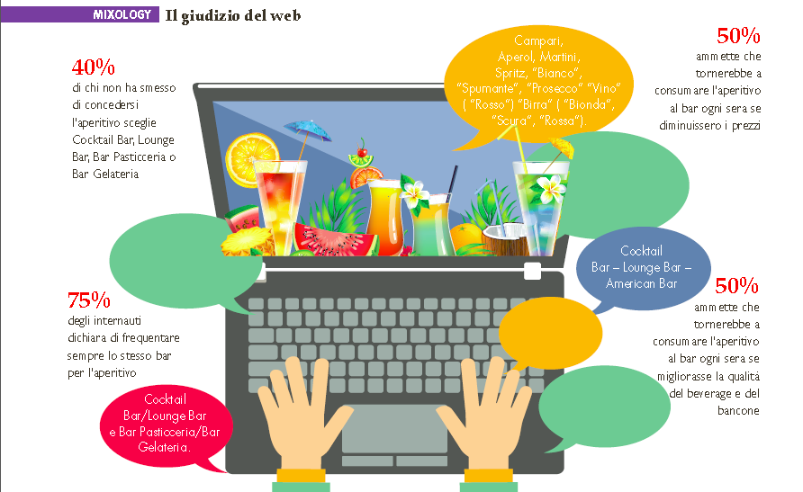 Infine, anche se non era obiettivo della web research effettuata, elenchiamo i cocktail maggiormente citati all’interno dei pareri analizzati; molti non sarebbero aperitivi, sebbene siano ritenuti tali dai naviganti. Nell’elencare tali cocktail non abbiamo tenuto conto delle varianti alla formula originale che spesso hanno accompagnato la citazione. Questi, in ordine di frequenza, i maggiormente menzionati durante tutto l’anno : Negroni, Gin Tonic, Cuba Libre, Margarita, Martini, Alexander, Bloody Mary, Bellini, Rossini, Manhattan. Sempre in ordine di frequenza, i cocktail molto citati solo stagionalmente: Mojito, Caiphiroska – Caipirinha, Pina Colada, Daiquiri, Sex on the beach, Sky Wasser. Tutti i classici sono rappresentati, non vi sono ai primi posti delle classifiche i cocktail moderni.