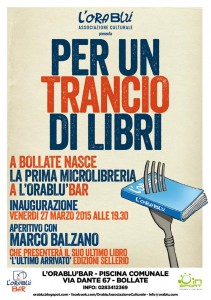 “E’ un esperimento e anche una provocazione” spiega Giancarlo Pasquali, vicepresidente dell’Associazione L’Orablù. “Visto che a Bollate non esisteva una libreria, abbiamo voluto dire che ora una libreria, sebbene ‘micro’, c’è. Al momento è formata da duecento titoli, di tutti i generi, che il distributore ci lascia in conto vendita. La libreria si inaugura ufficialmente venerdì 27 marzo alle 19,30, ma abbiamo già venduto una ventina di volumi. Per l’inaugurazione sarà qui Marco Balzano, noto autore di Bollate che presenterà il suo romanzo ‘L’ultimo arrivato’, pubblicato dall’editore Sellerio. Ci piacerebbe organizzare presentazioni di libri una volta al mese o ogni due settimane, e forse sarà proprio Marco Balzano ad aiutarci a contattare gli autori”.