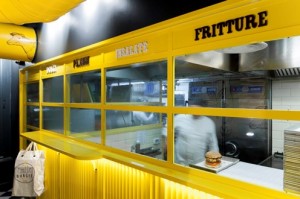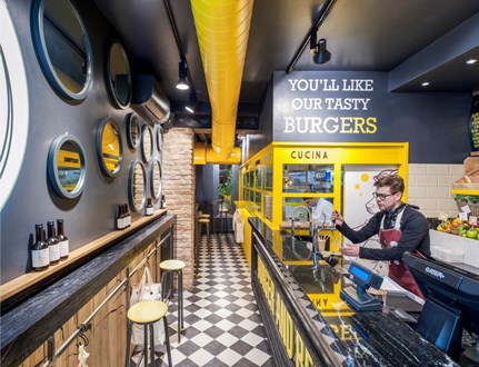 informato la progettazione dello spazio. Costa Group ha infatti tradotto lo spirito del locale, in un ambiente fresco e d'impatto, che spicca per la scelta cromatica giocata sul contrasto giallo-nero e pensato come una sfida alla logica dell’omologazione dei sapori: più che una hamburgheria, una scommessa all’insegna della qualità. La cucina a vista, è la vera anima del locale, con un aspetto spiccatamente industriale: lamiere ondulate giallo brillante, effetto container, a ricordare i camioncini per il cibo da strada. Il pavimento è a scacchi bianchi e neri, la colatura della vernice nera che lascia scie colorate sul legno grezzo; le pareti sono a piombo con specchi come oblò. Il tutto condito con una comunicazione fresca e d'impatto che riesce a trasmettere lo spirito Brillo, su menuboard, packaging personalizzato e sui fiori disegnati a mano che impreziosiscono tutta una parete.