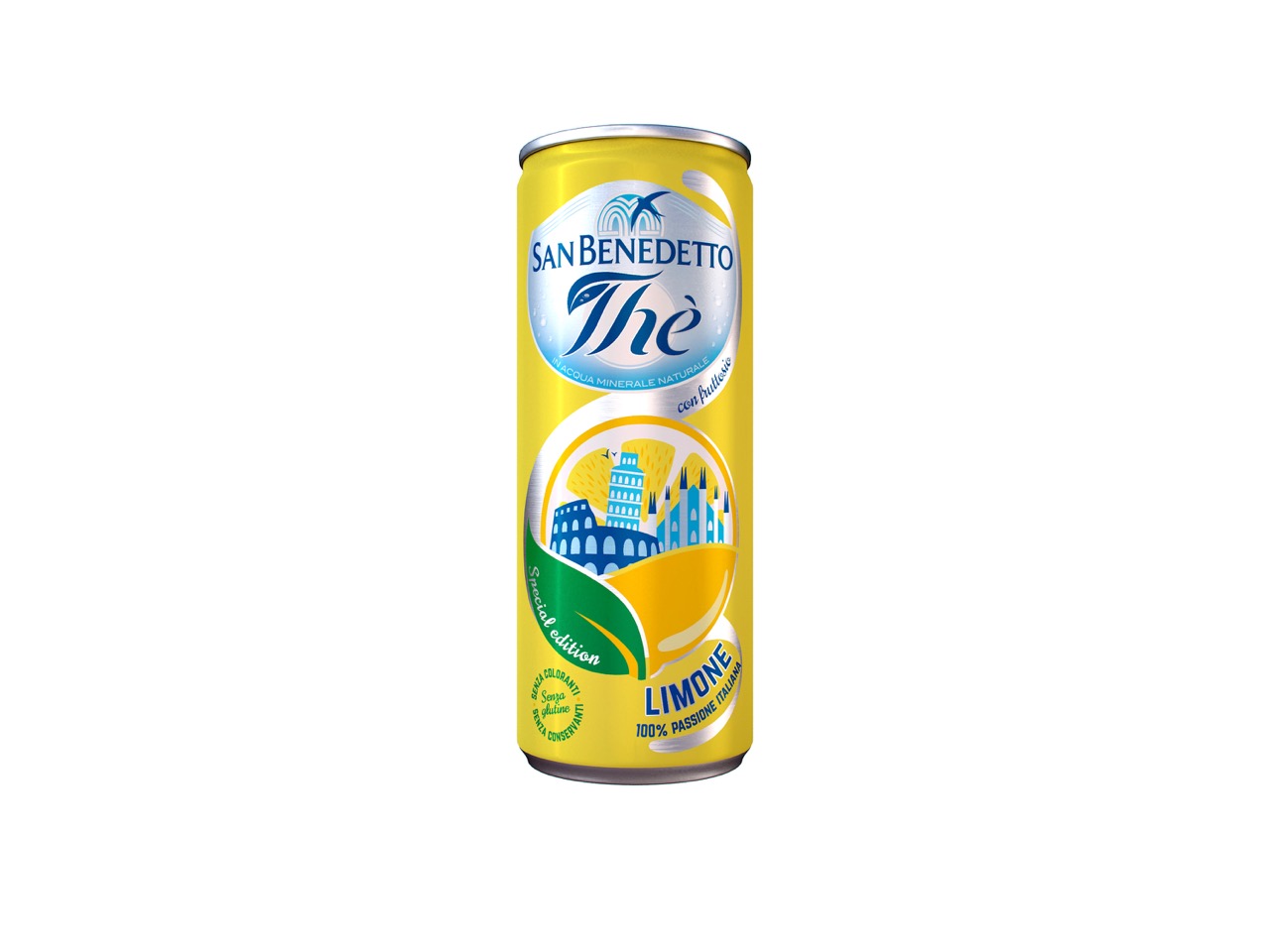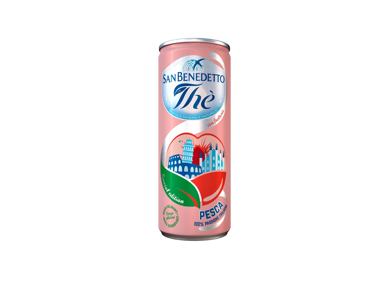 Tra le moltissime idee pervenute, tre quelle selezionate: tre lattine da collezione con un prezioso trattamento opaco, unico sul mercato, accomunate da un’etichetta animata dai monumenti simbolo dell’italianità: il Colosseo, la Torre di Pisa e il Duomo di Milano. Tre anche i colori, inediti per la categoria e ispirati a mondi raffinati per richiamare i gusti del Thè San Benedetto: verde acquamarina, per il Thè Verde con Aloe vera, rosa antico per la Pesca e giallo pastello per il Limone.