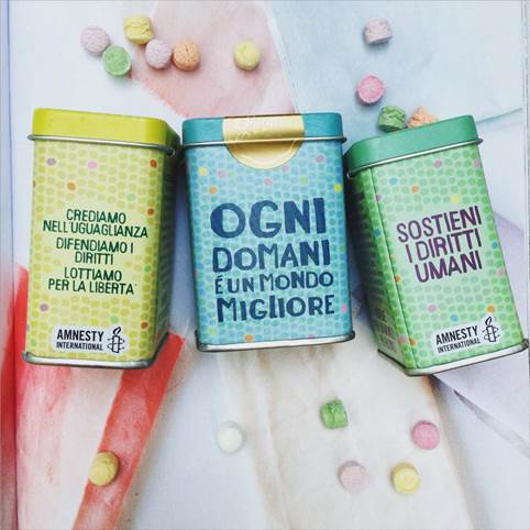 Pastiglie Leone, azienda dolciaria torinese fondata nel 1857, è orgogliosa di presentare un progetto nato in collaborazione con Amnesty Internationaìl - sezione Italia- nel suo quarantesimo anno di attività - in difesa dei diritti umani, della libertà e della giustizia. Una collezione, in edizione limitata, di tre lattine di pastiglie con un design unico, dalle brillanti tonalità pastello per far riflettere, pur con dolcezza, su temi profondi come il diritto all’uguaglianza e la difesa della libertà. Acquistando le lattine, contenti 42g di dolci colorati bottoncini, al classico gusto “miste dissetanti”, ognuno di noi contribuisce a sostenere Amnesty International- sezione Italia nella lotta quotidiana per un mondo più buono in cui i diritti umani siano goduti da tutti. Parte del ricavato delle vendite sarà devoluto da Pastiglie Leone ad Amnesty.