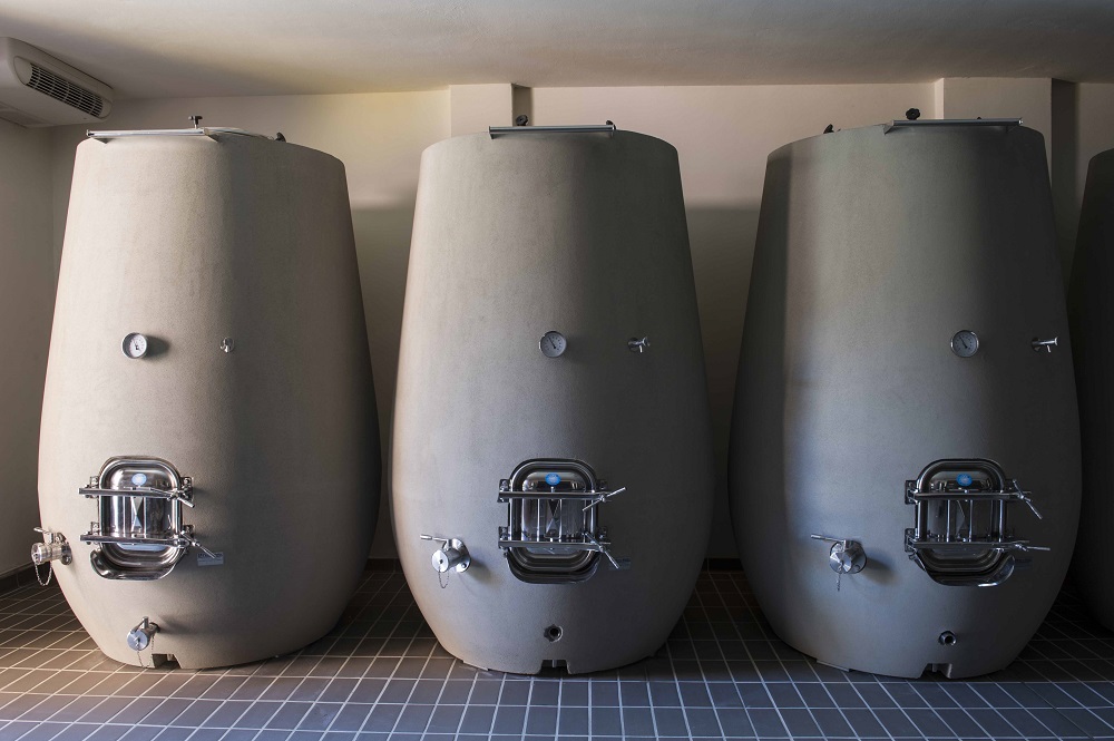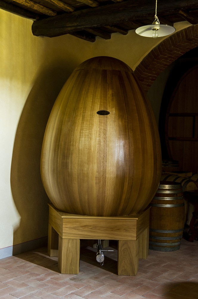 La botte “a uovo” dalla capacità di 22 hl, presenta due peculiarità: la forma ovale, per sfruttare appieno il moto convettivo, e l’assenza di cerchi. In essa il vino viene immesso in chiusura di fermentazione primaria, e quindi a seguire ha luogo la fermentazione malolattica. Sia per la particolare forma (più larga alla base e al centro e più stretta in alto) che per il calore conseguente la fermentazione, il vino che si trova in basso tende a scaldarsi e perciò a salire verso l’alto dove, incontrando il vino più freddo, si raffredda cominciando a ridiscendere verso il basso, e così a seguire. In questo modo si ha all’interno della botte un continuo movimento per trasporto di calore (moto convettivo) con una più omogenea e regolare dissoluzione delle sostanze del legno.