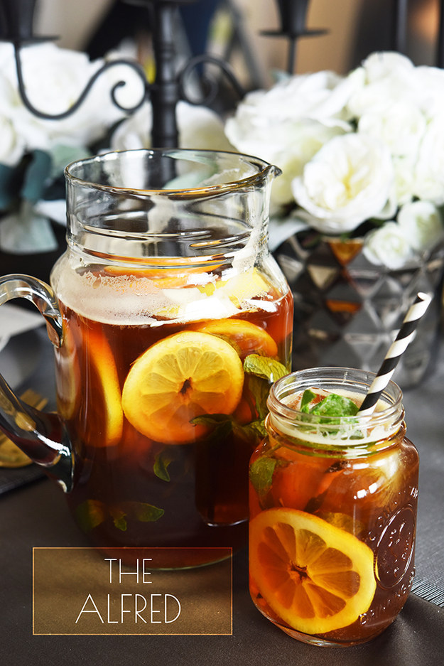 Lavate il limone e l'arancia e tagliateli a rondelle sottili. Aggiungere agli agrumi ilPimm e il tè in una grande brocca, mescolare e tenere in frigo almeno un'ora sino a che non è freddo. Per servire, aggiungere del ginger beer.