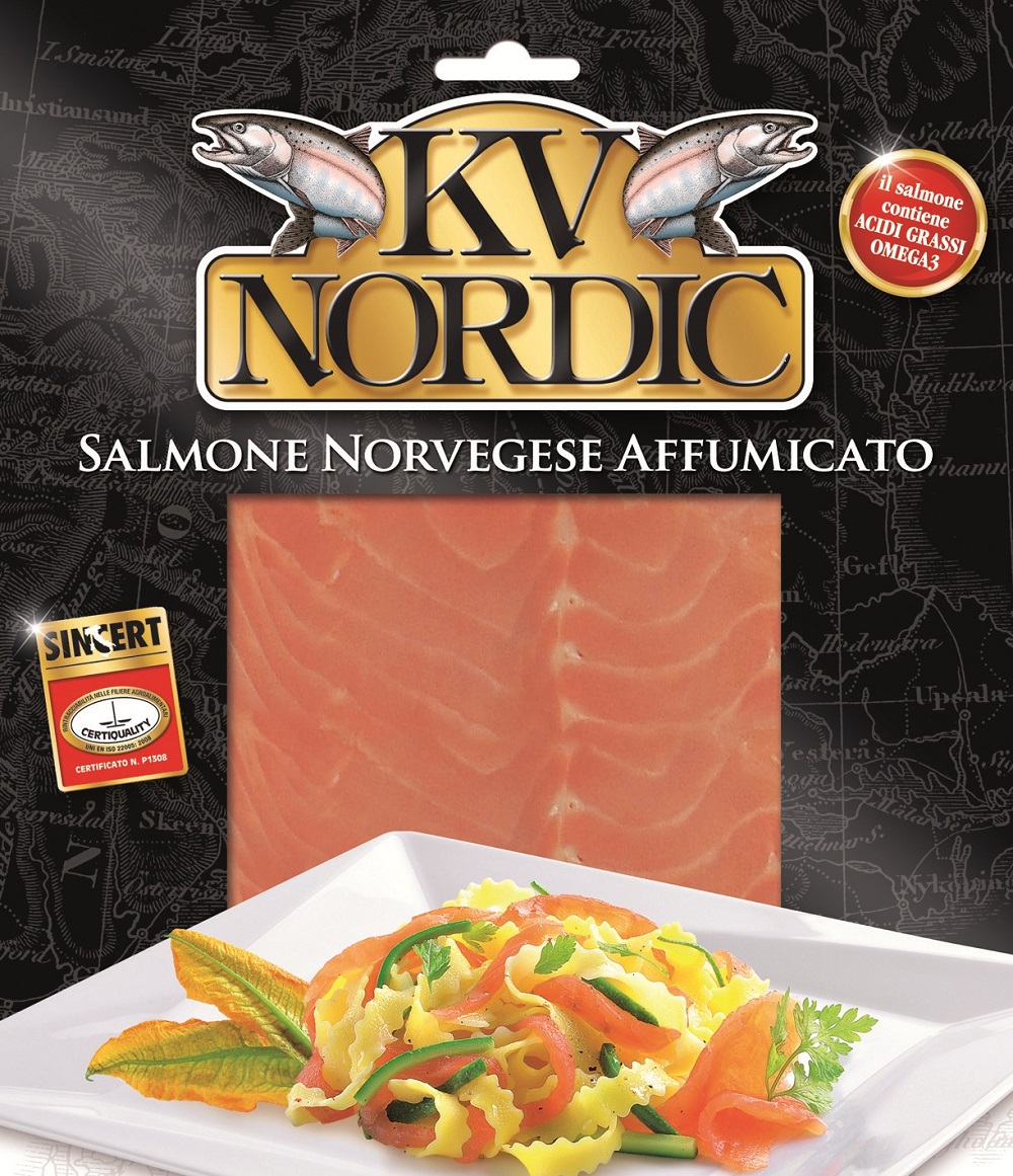Salmone Norvegese Affumicato Il salmone KV Nordic viene pescato nei mari del Nord, scrupolosamente selezionato all’origine ed affumicato. Il processo di affumicatura si svolge attraverso i metodi più tradizionali in stufe nelle quali viene bruciata una miscela di segatura e legni aromatici, che donano alla carne delicata un sapore particolarmente gradevole al palato esaltandone il gusto. Dopo l’affumicatura il salmone viene confezionato in baffe, cioè intero, o affettato in buste pronte all’uso.