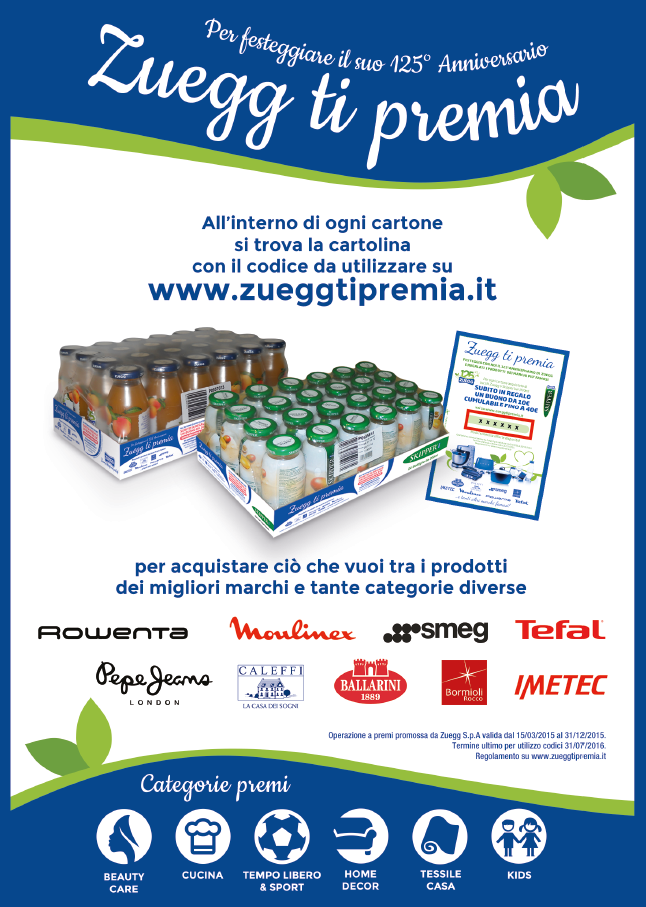 La linea Skipper Bar 200ml, insieme alla linea Zuegg Bar, è protagonista del concorso dedicato ai baristi “Zuegg ti premia”. Con la promozione, attiva da marzo 2015, è sufficiente acquistare un cartone di succhi Zuegg Skipper Bar 200ml per ricevere subito in regalo un buono da 10 euro (cumulabile fino a 40 euro) da spendere su una piattaforma dedicata www.zueggtipremia.it, ricca di articoli di brand noti; qui, oltre a decine di referenze sempre disponibili, si aggiunge ogni mese almeno un prodotto nuovo nell’area “novità”.