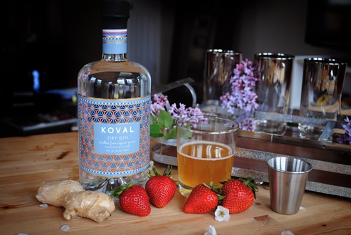 Utilizzate un bicchiere da pinta in vetro e mescolate il succo di 4 fragole con 100 ml di Koval Dry Gin e 30 ml di sciroppo di zucchero. Versate il cocktail in due bicchieri precedentemente riempiti con ghiaccio, aggiungete il thè di kombucha freddo e qualche fettina di zenzero.