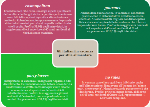 Cosmopolitan E’ la tipologia più numerosa e va contro lo stereotipo dell’italiano indissolubilmente legato alla cucina di casa e poco aperto alle sperimentazioni. Gli intervistati si dichiarano per il 38% curiosi e senza frontiere: gli italiani cosmopoliti, ormai in maggioranza, amano assaggiare il cibo tipico della località visitata, per assaporare fino in fondo la cultura locale. Si tratta soprattutto di adulti che in vacanza si liberano delle proprie abitudini alimentari per calarsi in quelle del territorio che li ospita.
